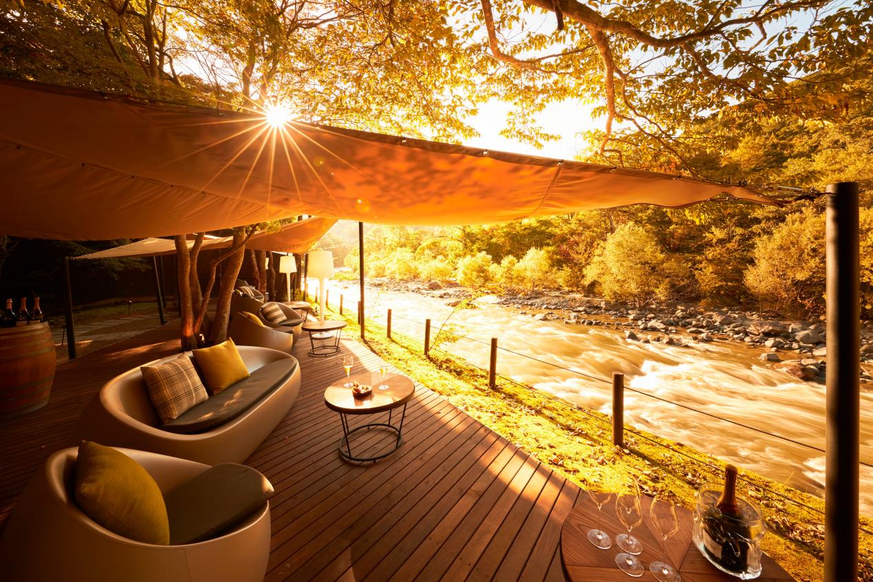 为延续浴后余韵,酒店特邀侍酒师调制专属饮品:红叶香槟鸡尾酒。香槟为基底,融入以干燥葡萄酿造、风味浓郁的稻草酒,散发出蜂蜜般的甜香与层次迷人的辛香气息,让人联想起奥入濑秋林中的桂树。